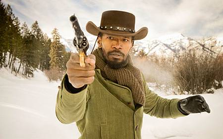 主角傑米福克斯本片的演技鋒芒幾乎被同片其它演員搶過,但他的拔槍動作的確練得神準快速,拔槍/轉槍/收槍動作一氣呵成,絕對有苦心練過。雪地中對雪人練槍誇飾著南方第一神射手的準確,同時也有著惡趣味。農莊爆炸背景下微笑刁菸回眸的他,那影像應該是向某懷舊電影取經,但居然讓我想到兩年前的雷哥(飆風雷哥,Rango,2011),也算天外飛來的有趣聯想。傑米福克斯的身材壯碩,無論是片頭脫衣或中後段被倒吊,刻意顯露的肌肉突顯著黑人的強健體魄。唯一稱得上演技的應該是:他有演出了一種會克制不住的拔槍衝動,觀影時得不斷『擔心』這位槍法準/身體素質棒但頭腦簡單的黑人,會不會沉不住氣地衝動誤事…。